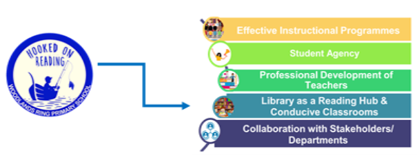Our Key Learning Programme (KLP), Hooked on Reading (HOR), is anchored on five key prongs, as illustrated in the diagram above. The programme aims to equip students with essential language skills to become effective communicators and writers, discerning readers, and critical thinkers—competencies that are vital for success in the 21st century. A school-wide reading programme that aims to develop a strong reading culture through allocated reading and library periods, P3 twisted tales programme, library programmes, developing language ambassadors, teachers' professional development, parents' engagment sessions and partnership with National Library Board .